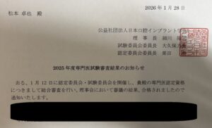 ここ5年くらいは日本口腔インプラント学会専門医になることを第一目標に頑張ってきましたので、とても嬉しいです!